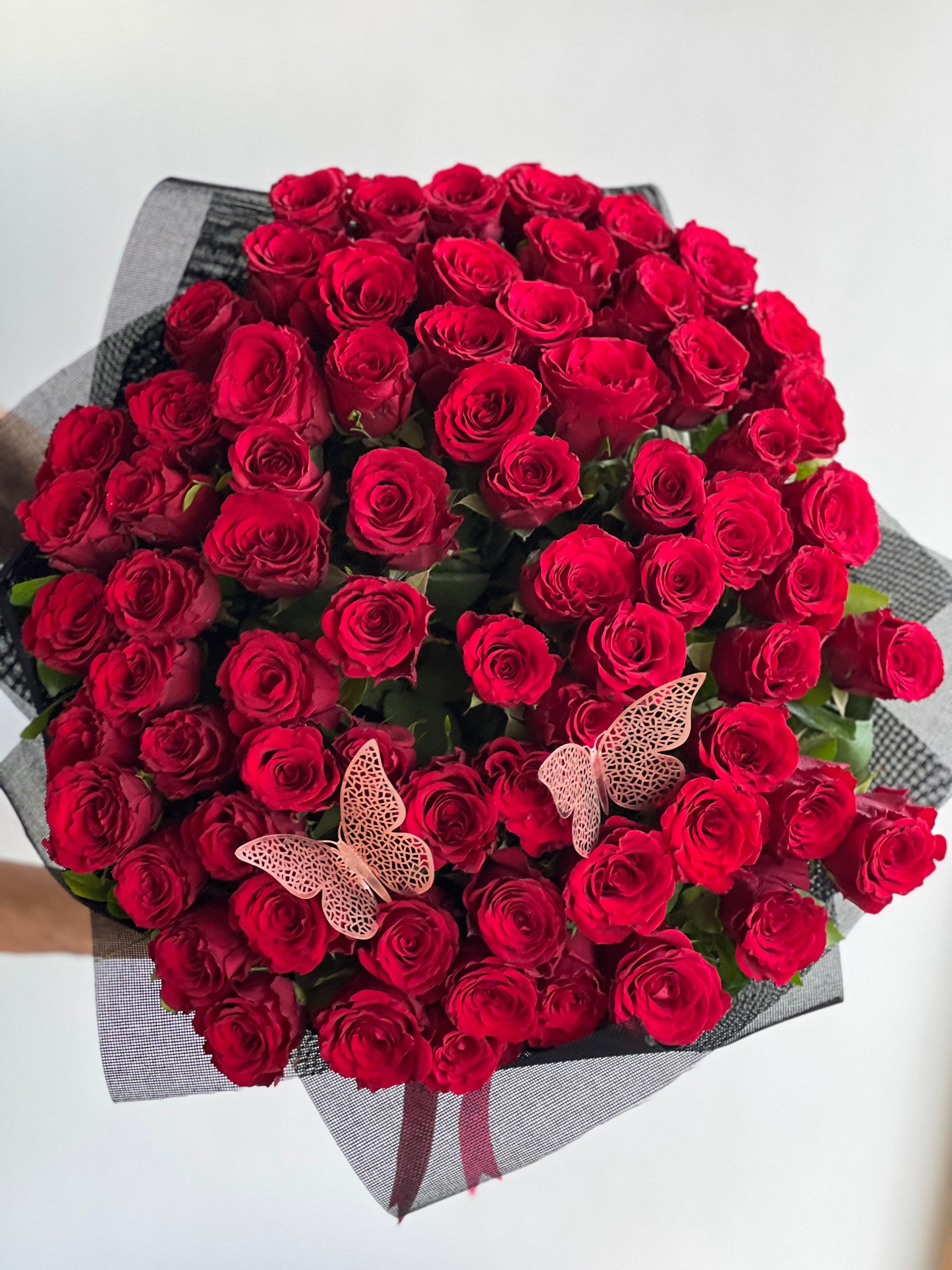 Grand gesture of love for your dearly beloved. Hand tied bouquet of 100 long stem roses.