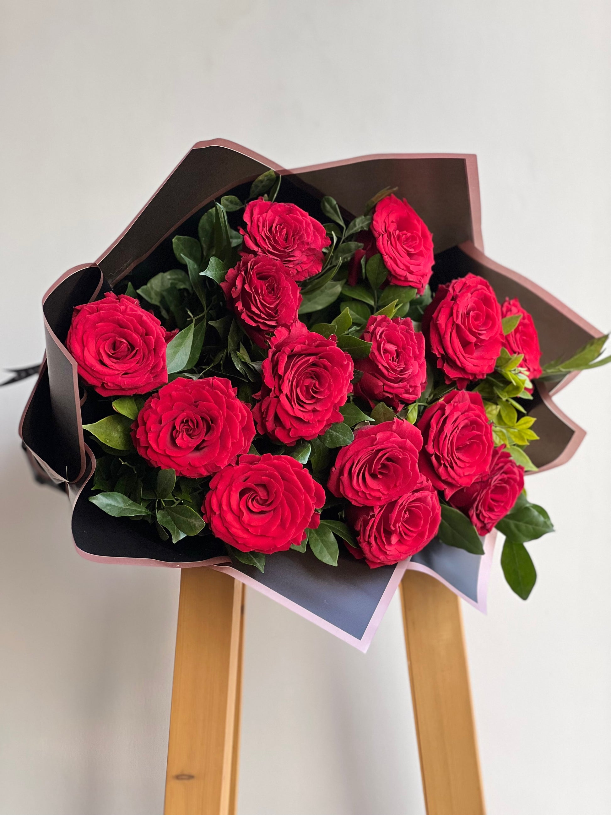 Valentine's best-seller featuring 14 long stem red roses and lush foliage. Simple and effective gifting with this beautiful bouquet.