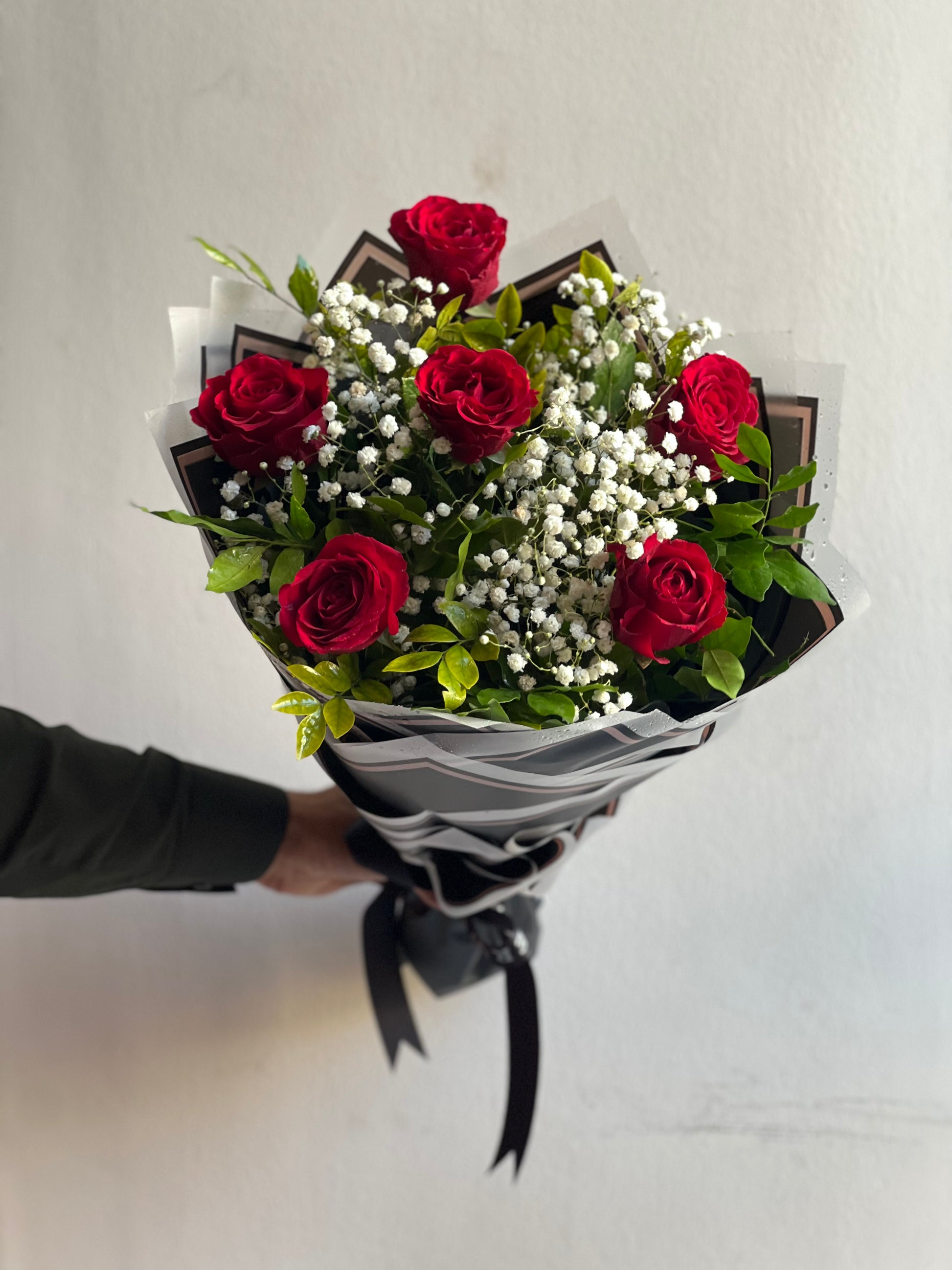 Simple and effective gifting with this bouquet of long stem roses and baby's breath
