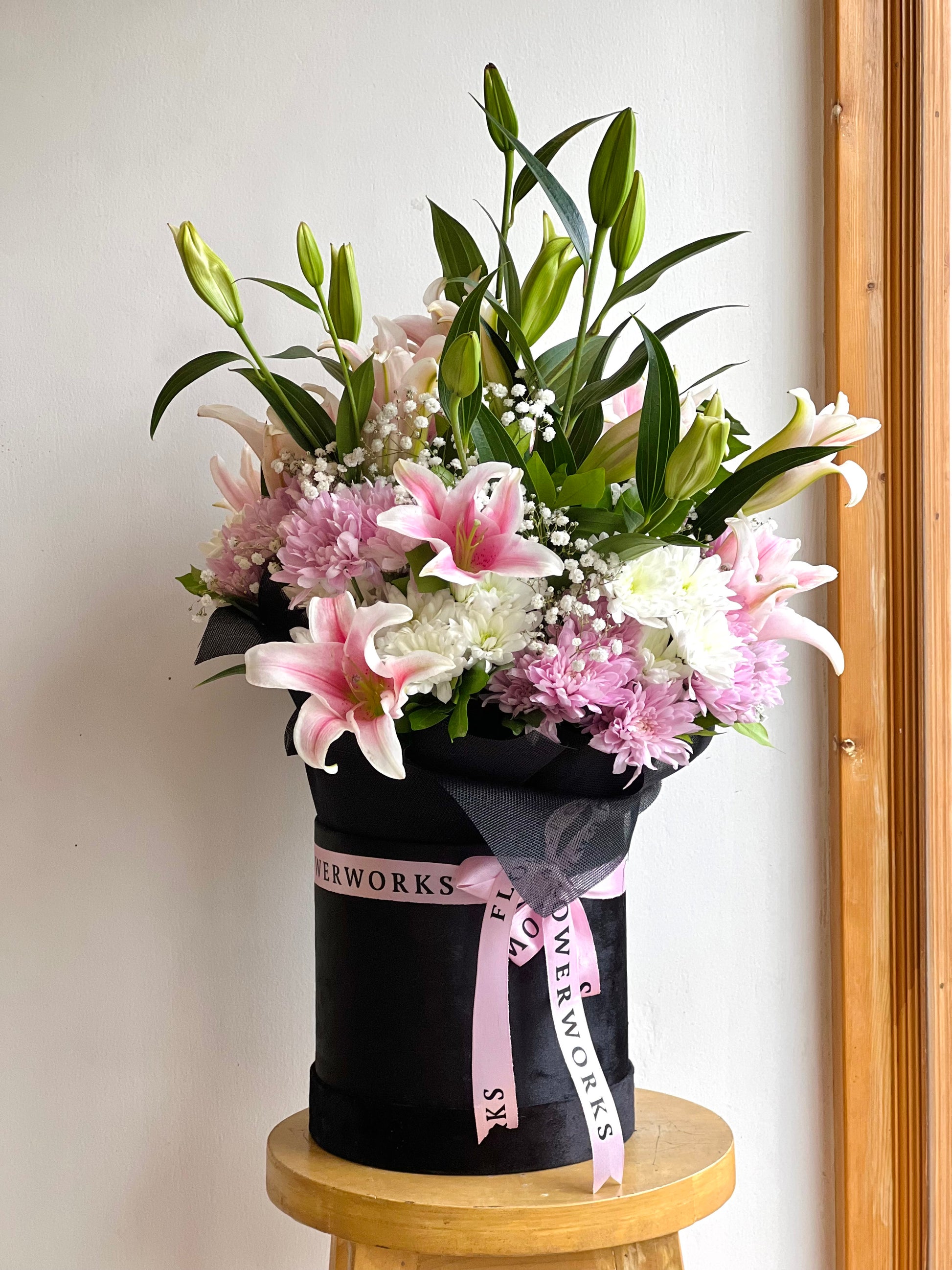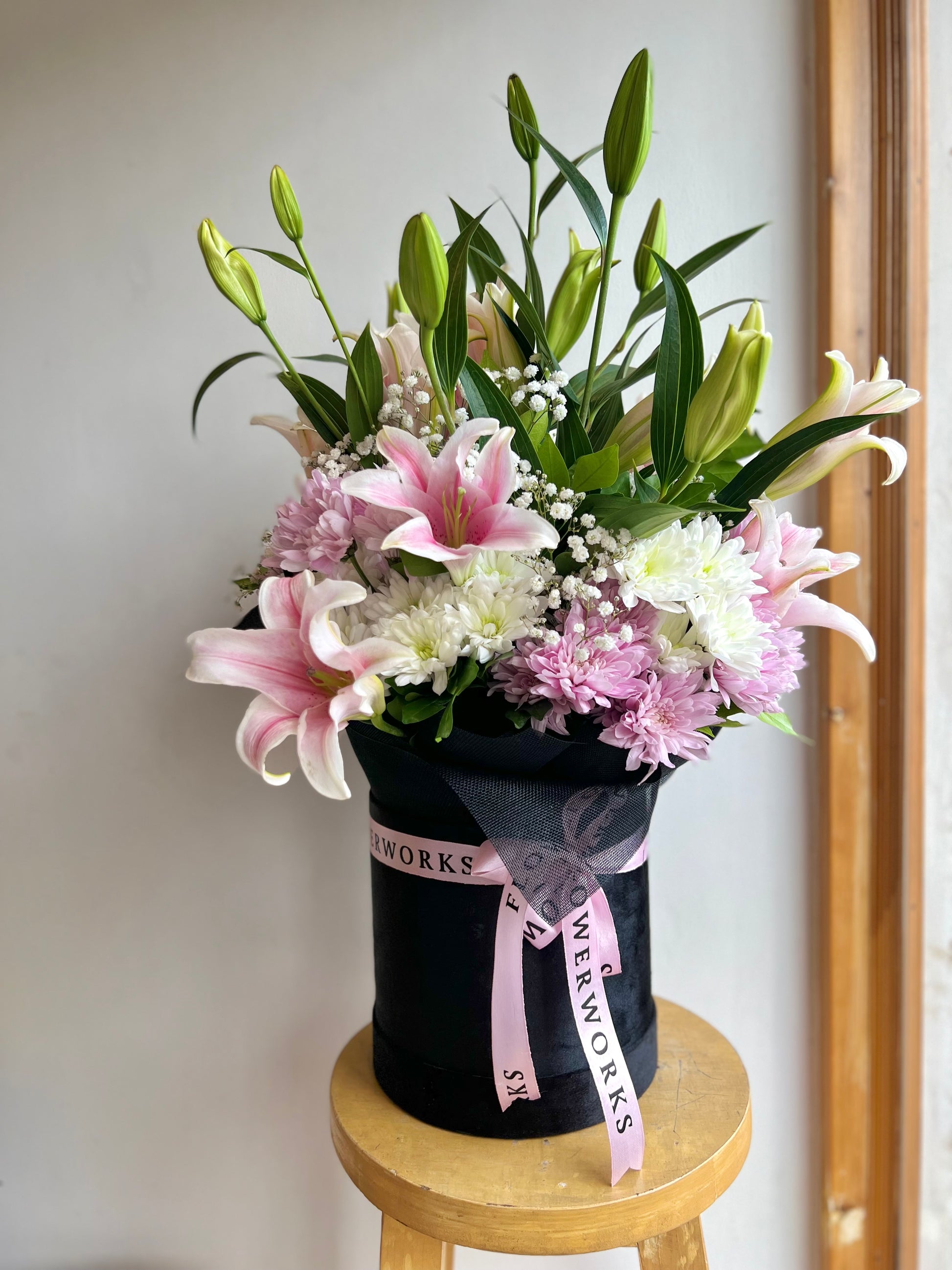 Hand tied bunch of 4 stems of lilies, 12 stem chrysanthemums, 2 stems of baby’s breath, placed in our Velvet Box.