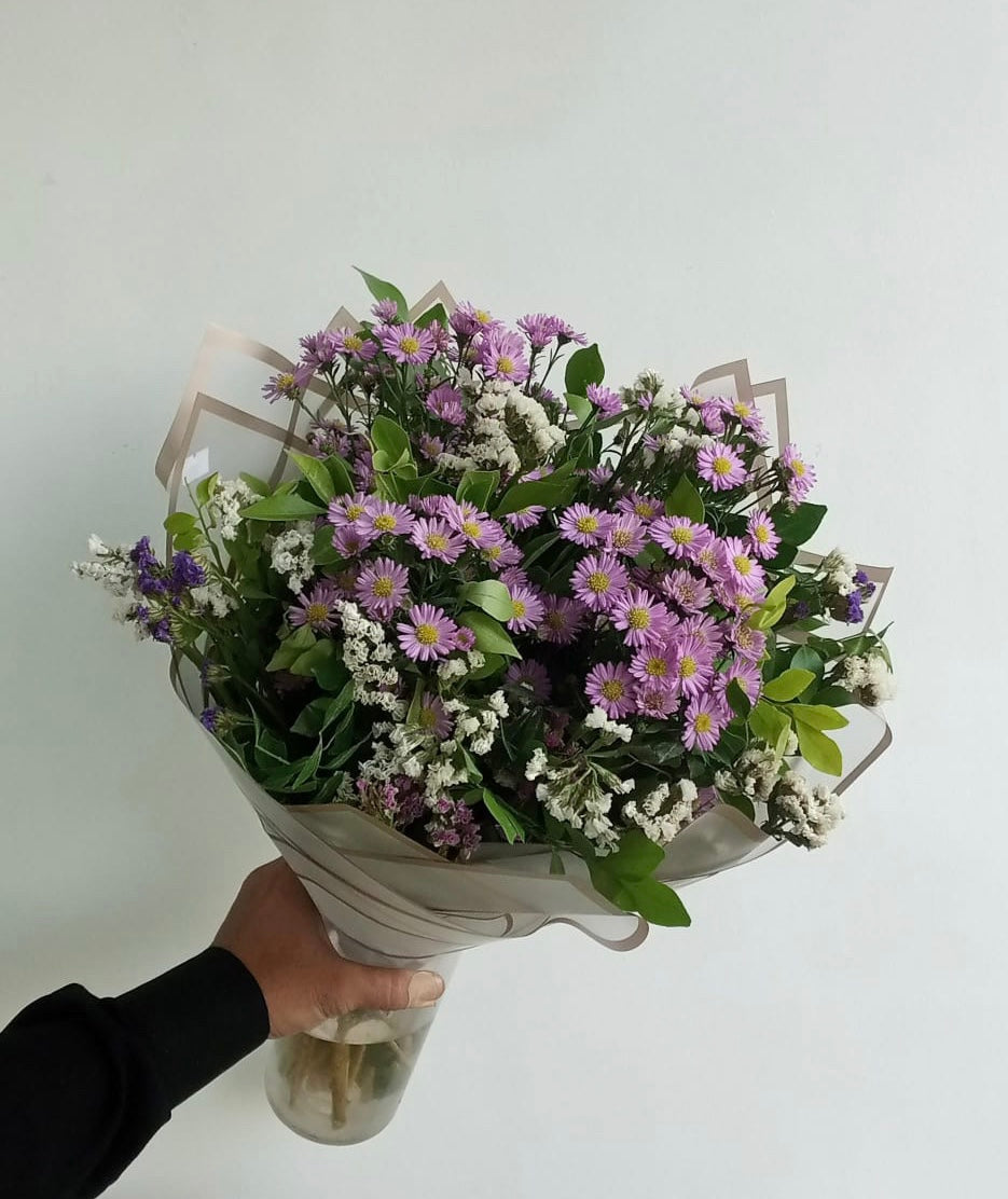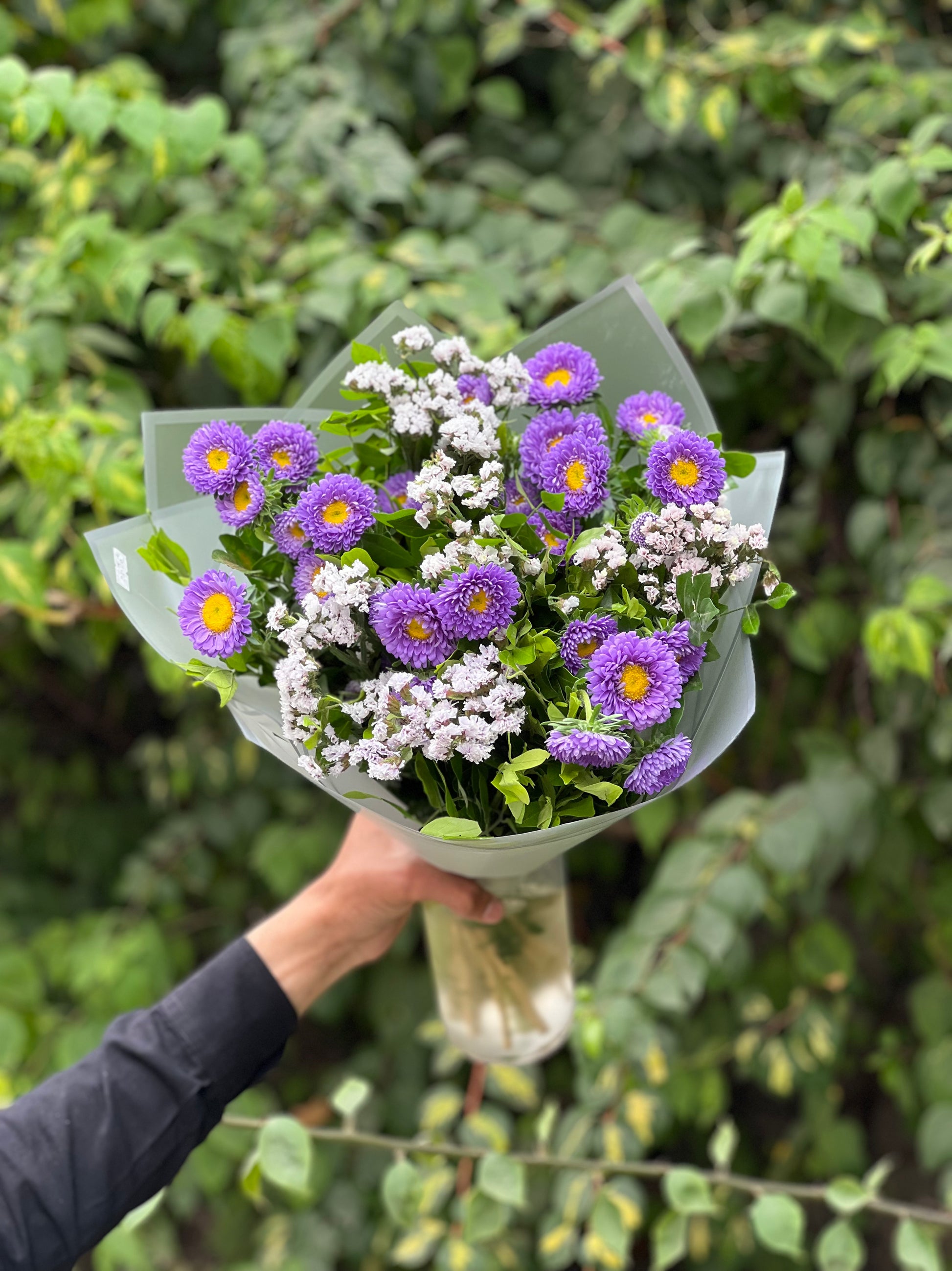 This bouquet consists of asters and statice. Both are locally grown flowers.