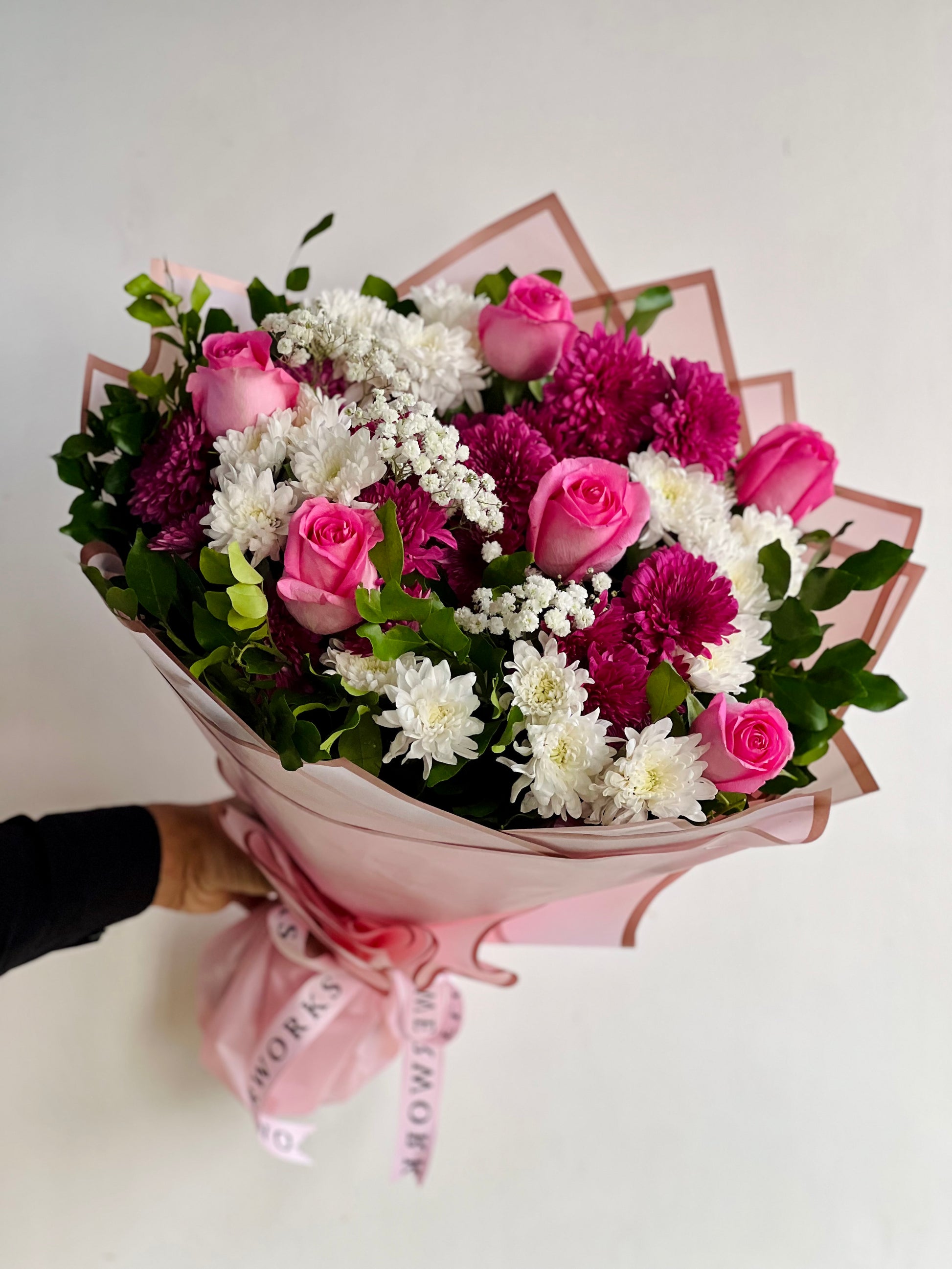 This bouquet is a mix of 6 rose stems, 9 chrysanthemum stems with baby’s breath and foliage. Please note colors of flowers and wrapping can vary depending on availability.