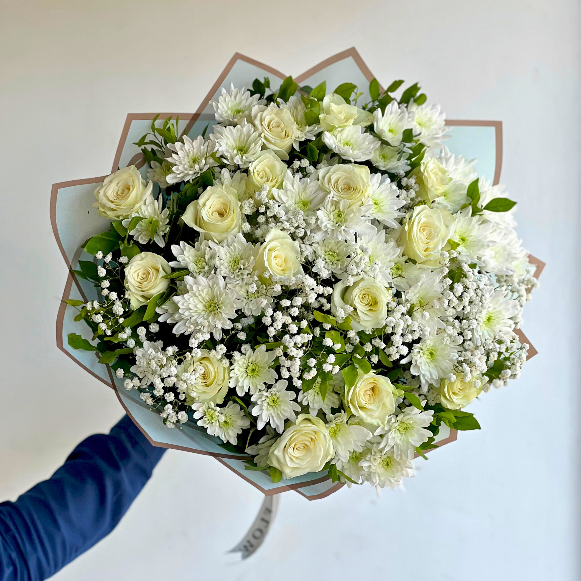 A stunning fusion of 15 beautiful roses, 15 vibrant chrysanthemums with baby's breath, and foliage. This bouquet is a celebration of colors, textures, and natural beauty.