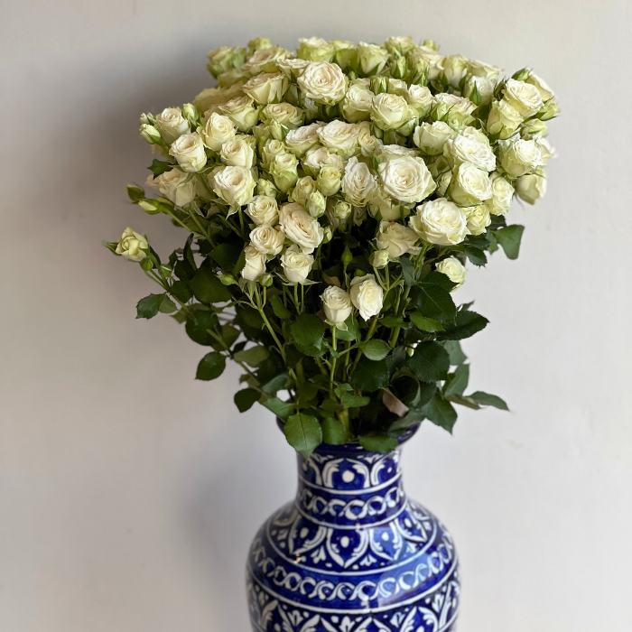 Large Vase of Blue Pottery with 20 stems of spray rose (or chrysanthemum, depemding on availability).