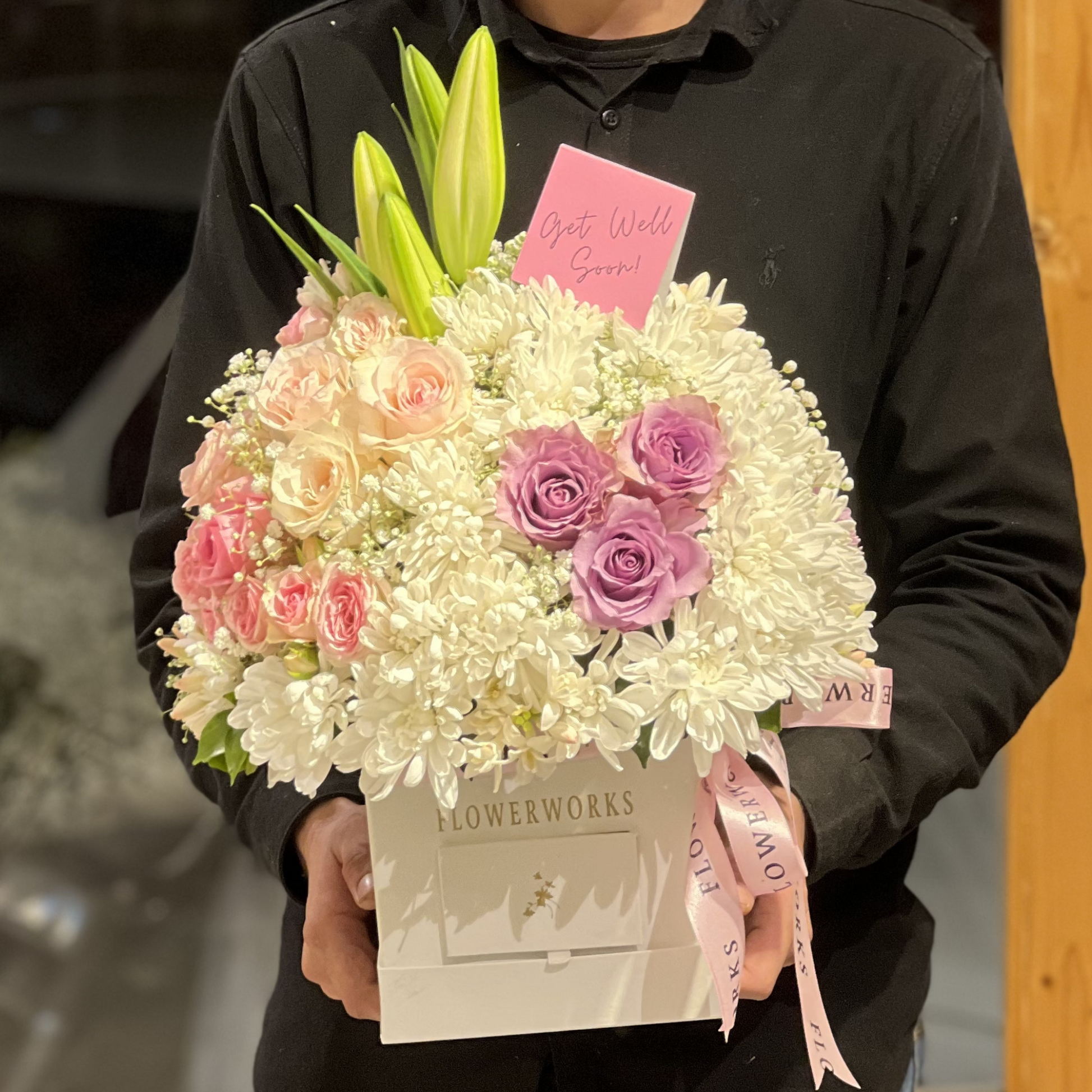 Small box with Lily, Rose, Spray Rose, Chrysanthemums and Baby's Breath