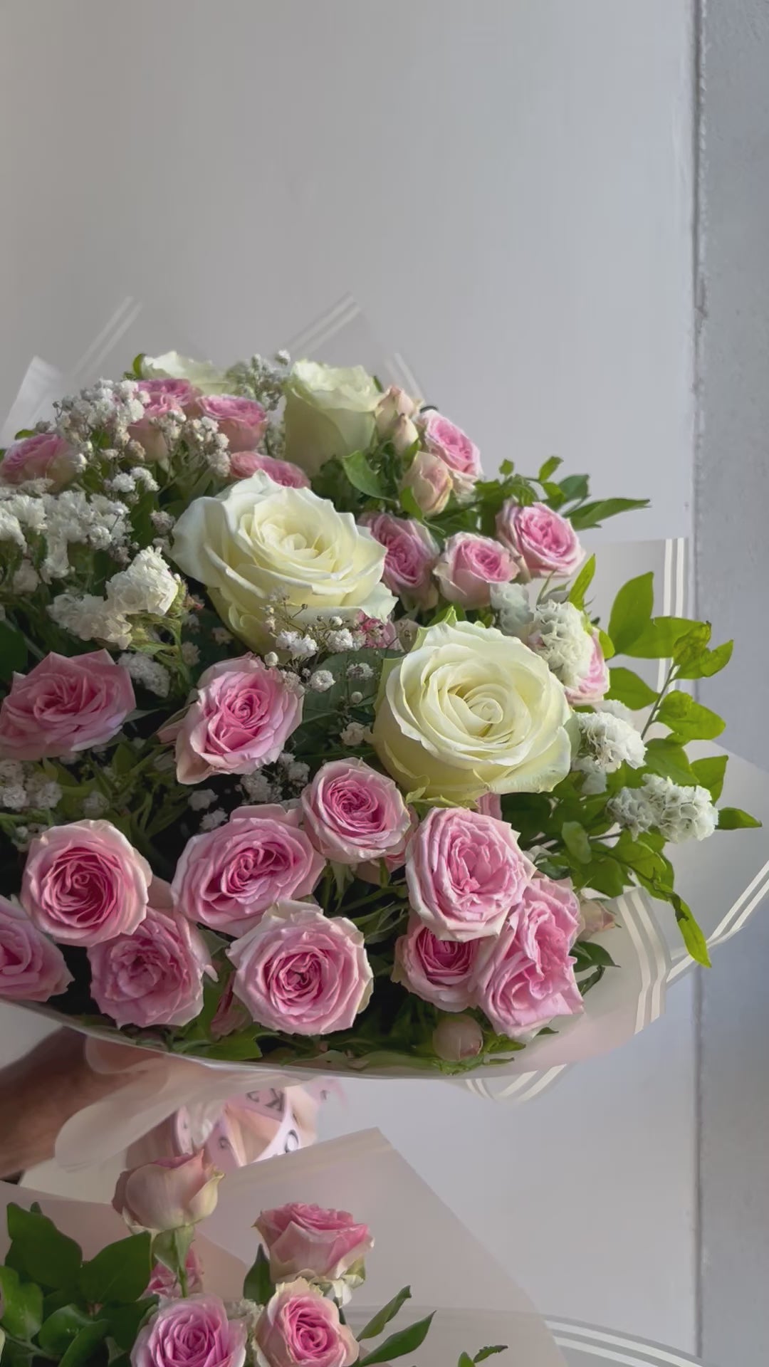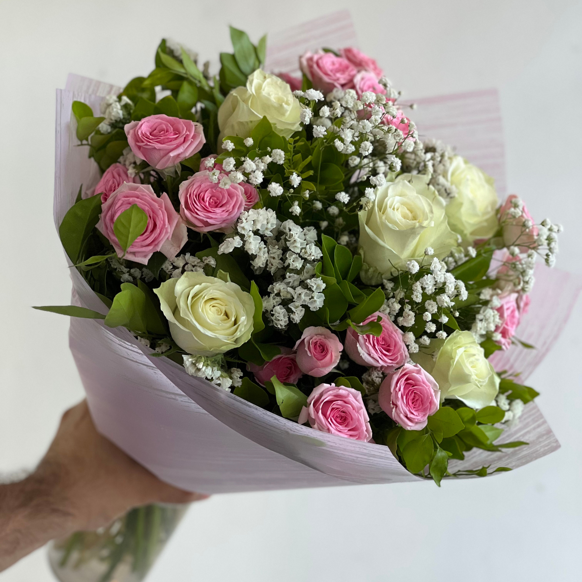 5 stems of White Rose, 4 stems of Spray Rose (can be replaced with chrysanthemum in case of unavailability) with foliage, baby's breath and statice