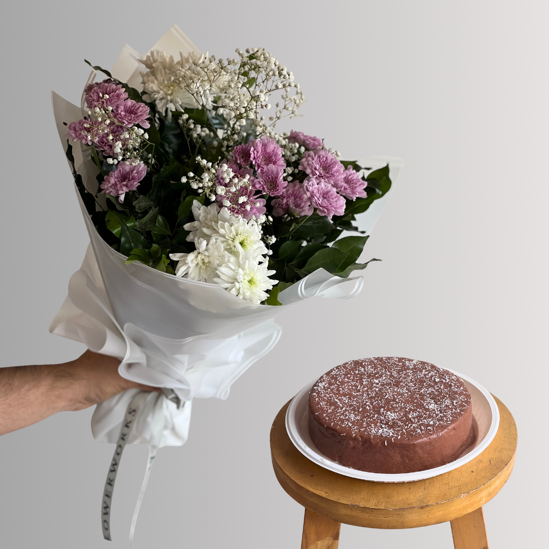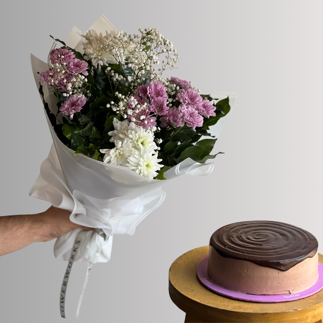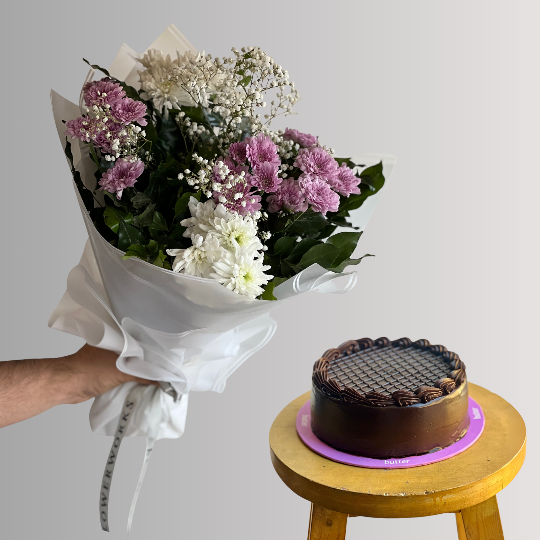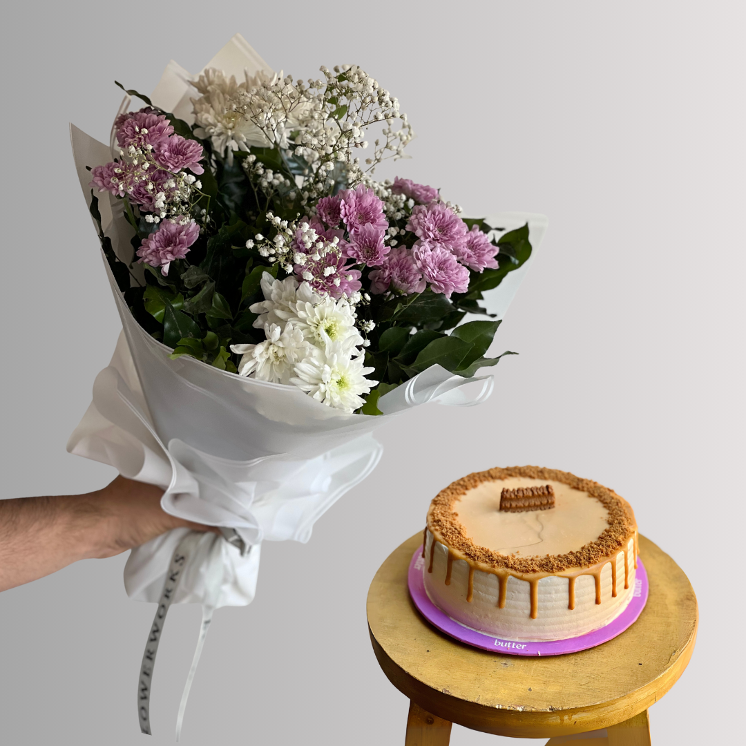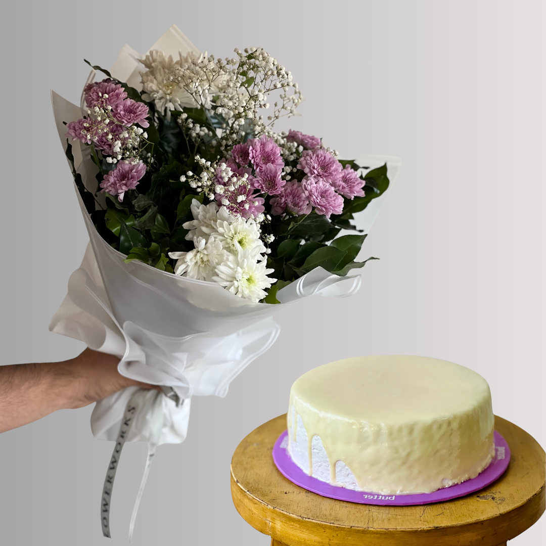 This beautiful bouquet is a stunning combination of whits and lilac chrysanthemums, with a touch of baby's breath.