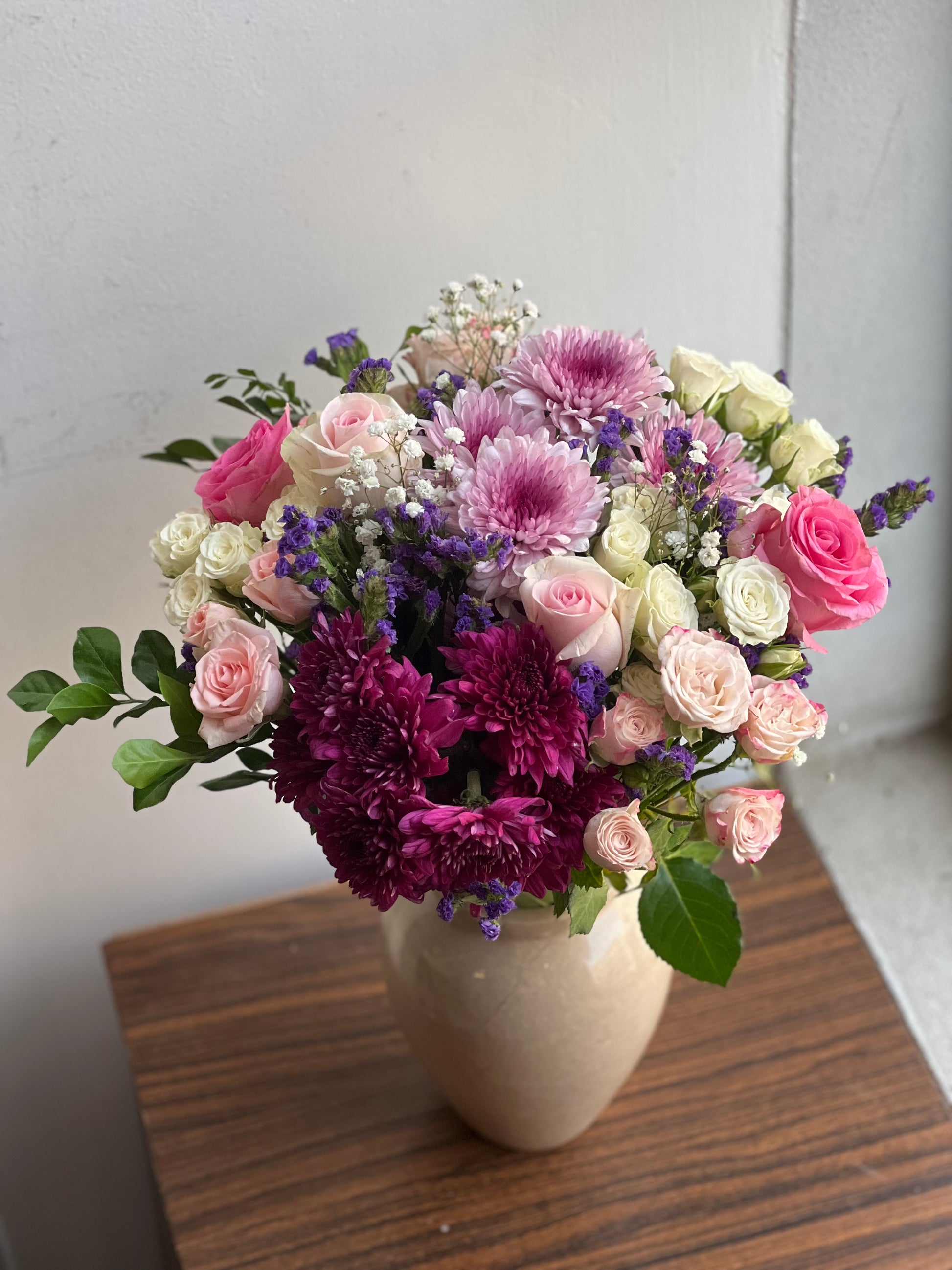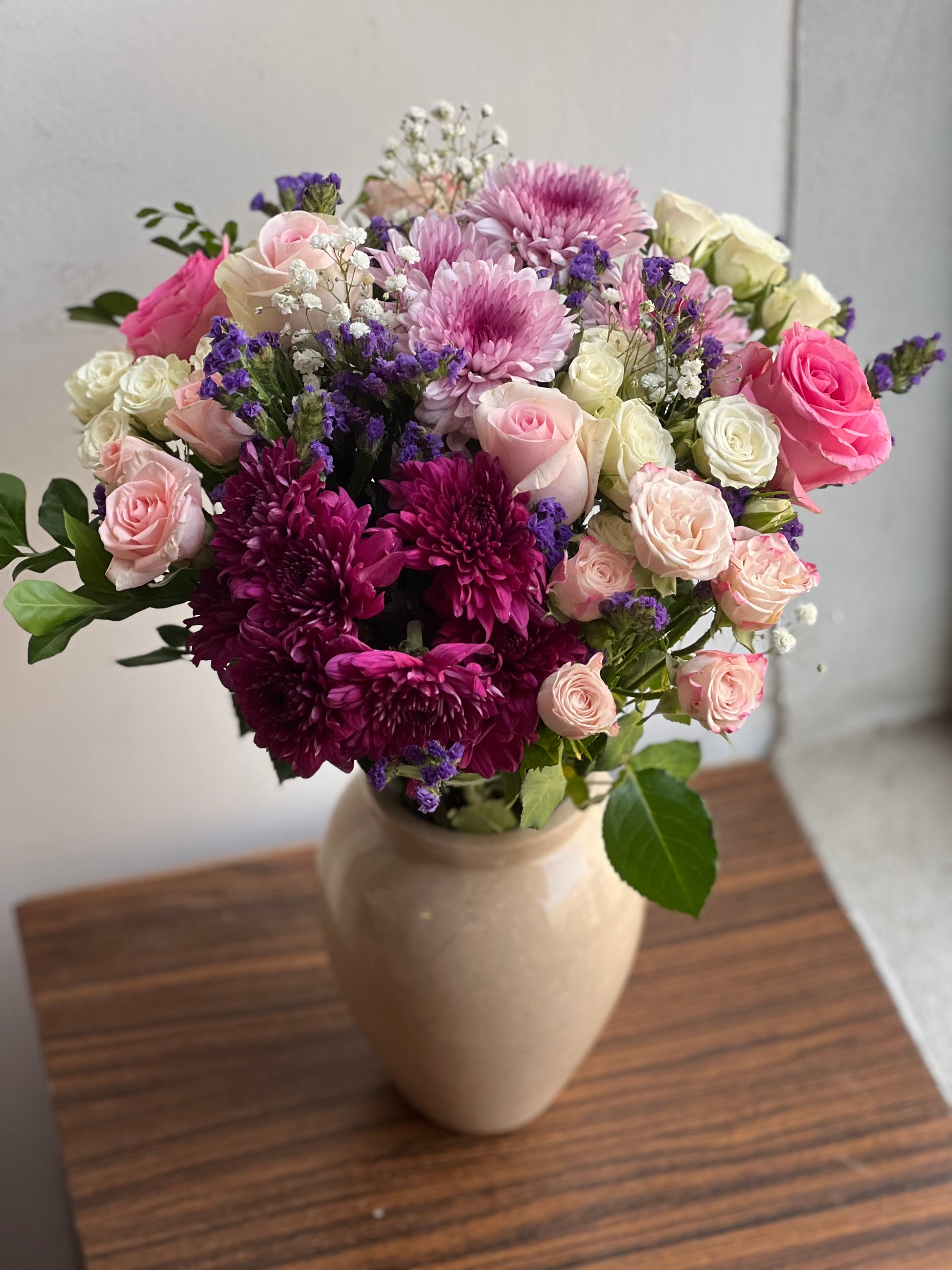 Roses, chrysanthemums, spray roses, statice and baby’s breath in this marble vase by zeb homes