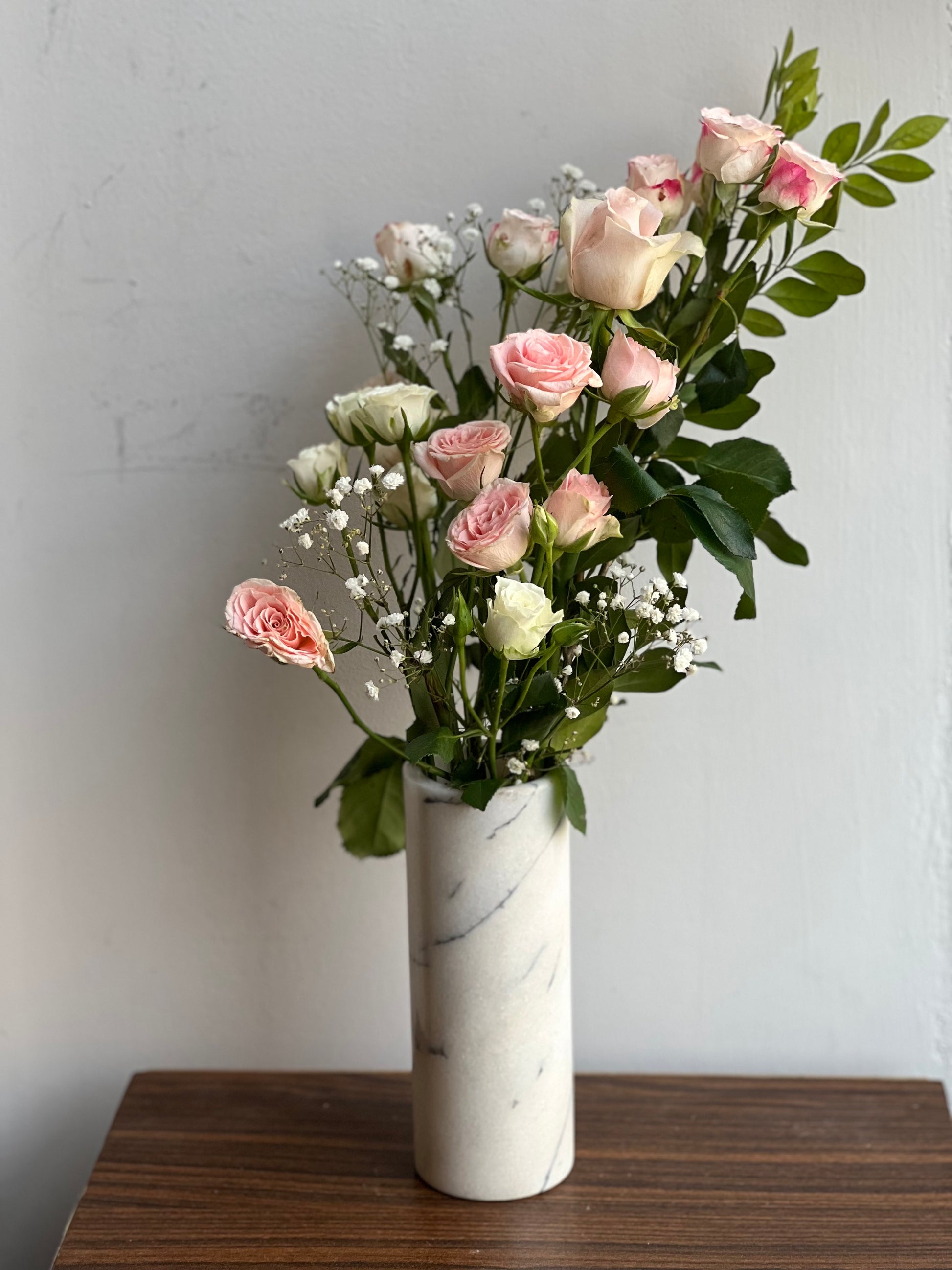 Pastel colored roses, spray roses and baby’s breath in this marble tumbler by zeb homes