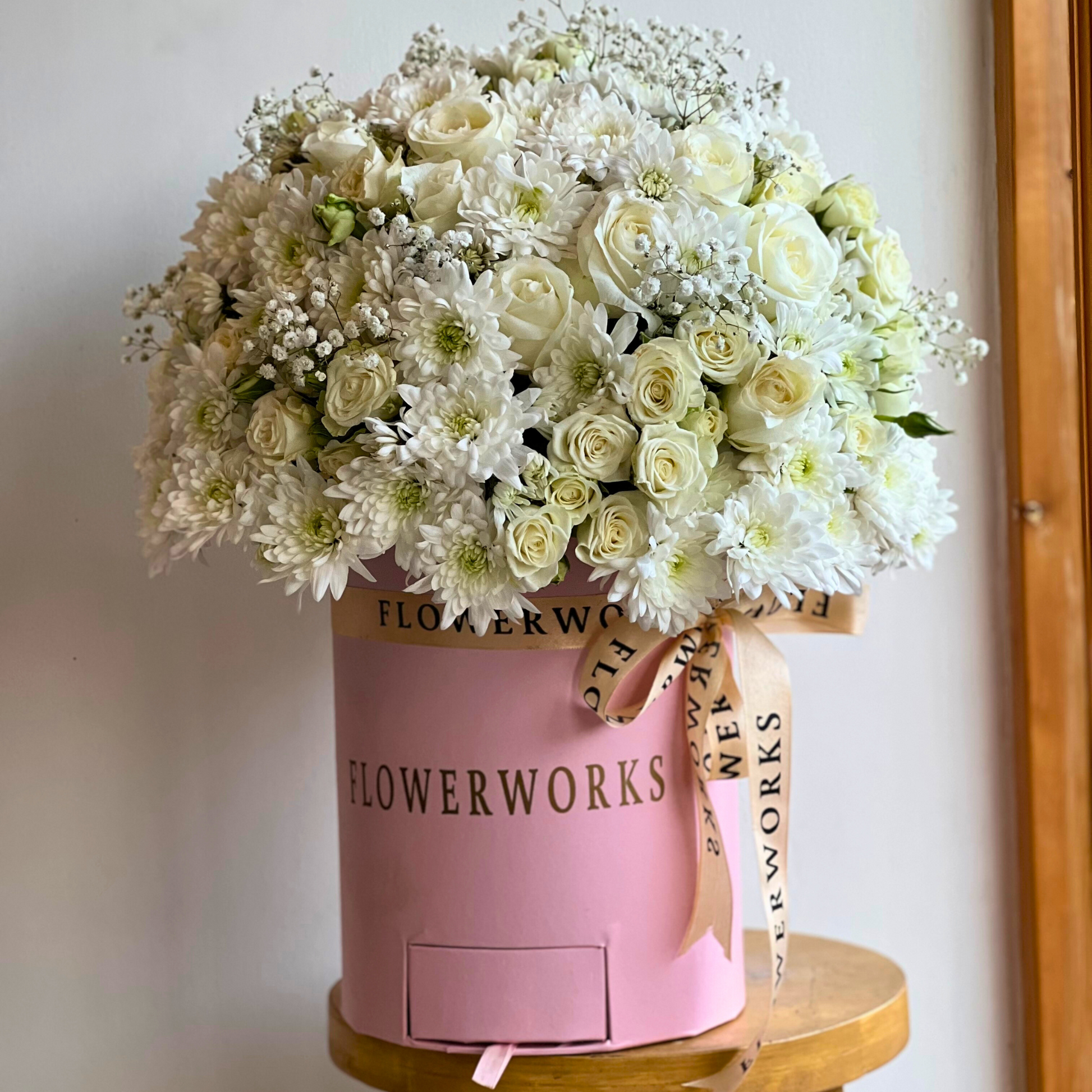 All White arrangement in our large Pink or White Box with Chrysanthemums, White Rose, White Spray Rose and Baby's Breath
