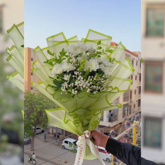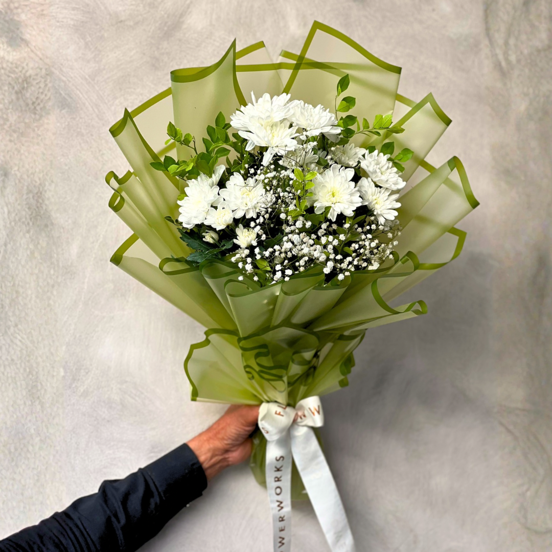 This elegant bouquet features a beautiful blend of fresh chrysanthemums in soft white complemented with delicate baby's breath and lush green foliage. Carefully handcrafted by expert florists, this arrangement is perfect for expressing love, appreciation, or celeberating special moments.