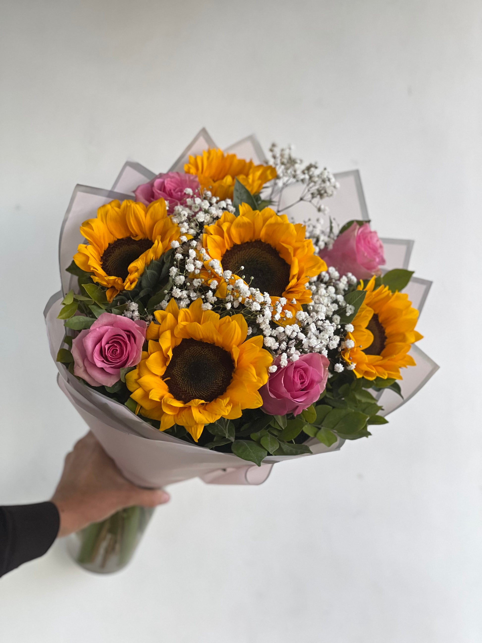 Beautiful and bright colors to add for someone special to brighten up their day. Perfect blend of the two most favorites, Sunflowers and Roses.