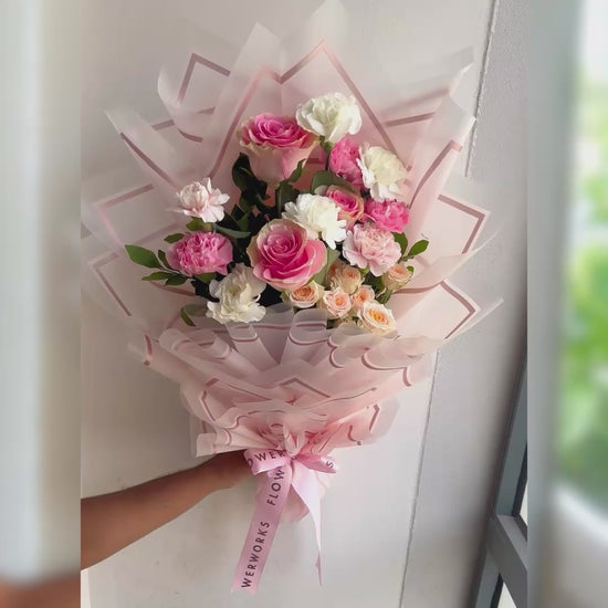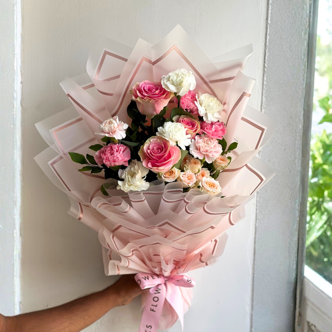 This beautiful bouquet features a mix of pink and peach roses paired with fluffy white and pink carnations. Wrapped in layered, frosted pink paper with a matching ribbon, it’s a sweet and simple gift for any occasion.
