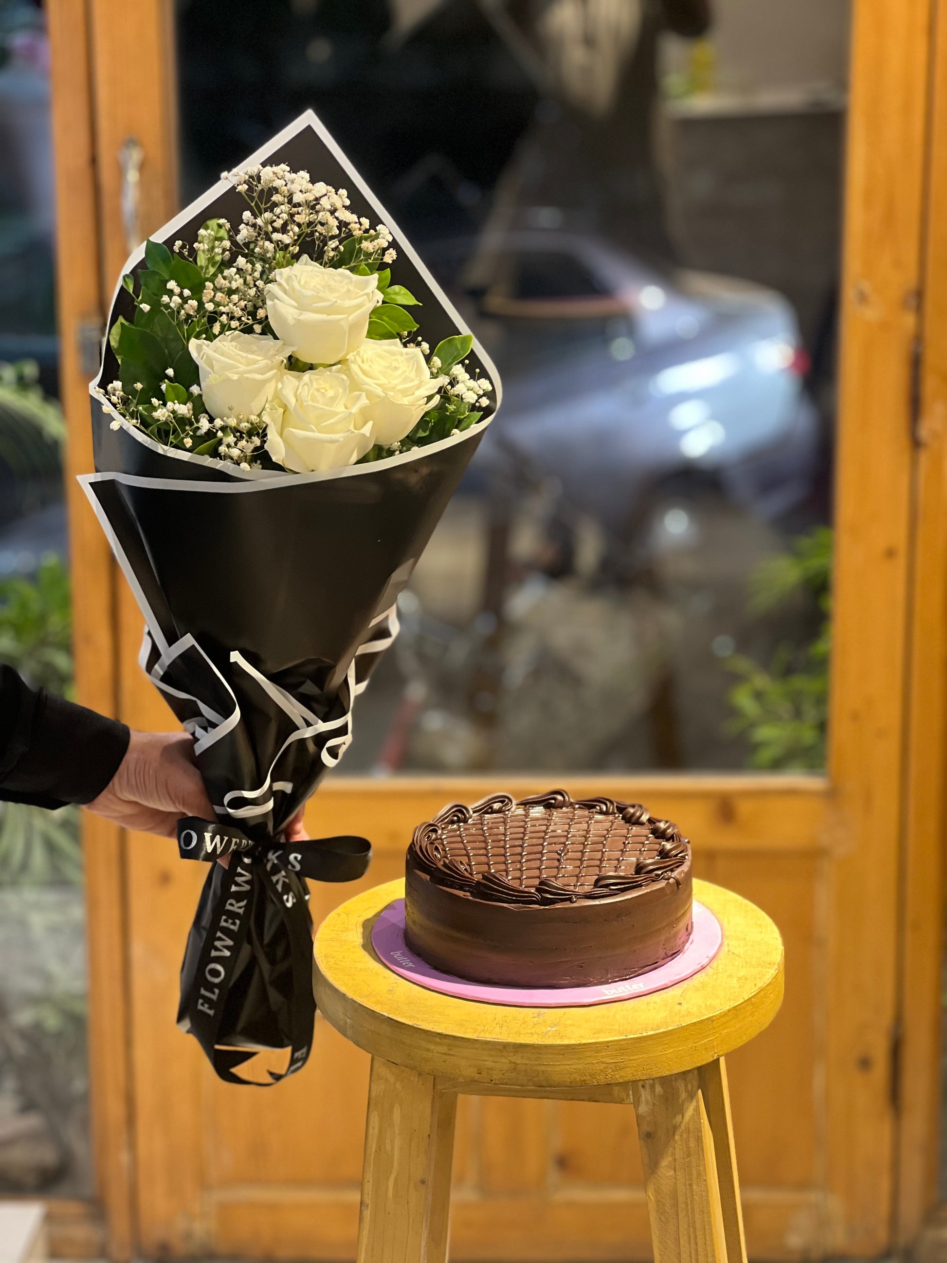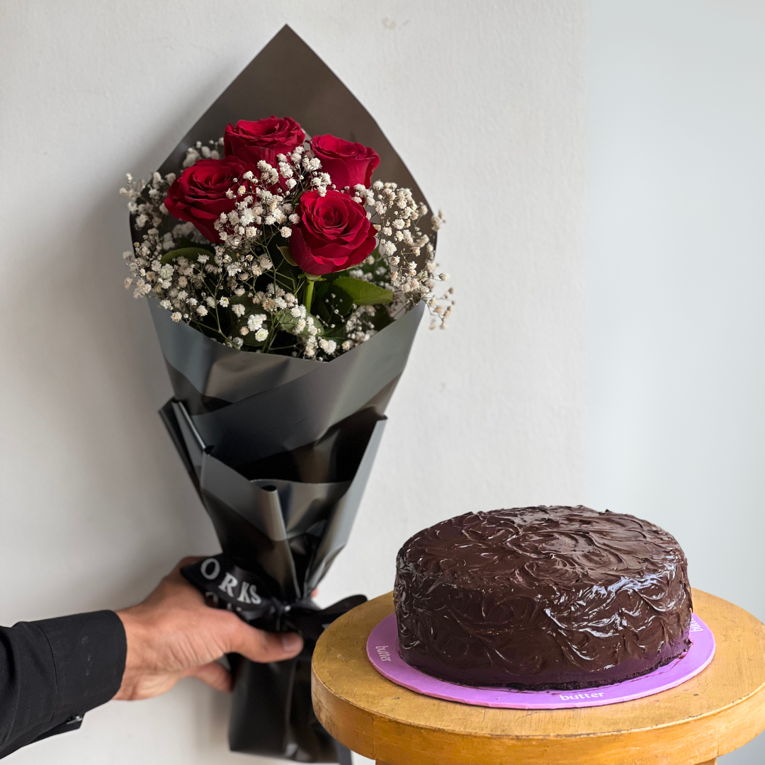 Pick a cake of your choice with a small rose bouquet in red,pink or white rose
