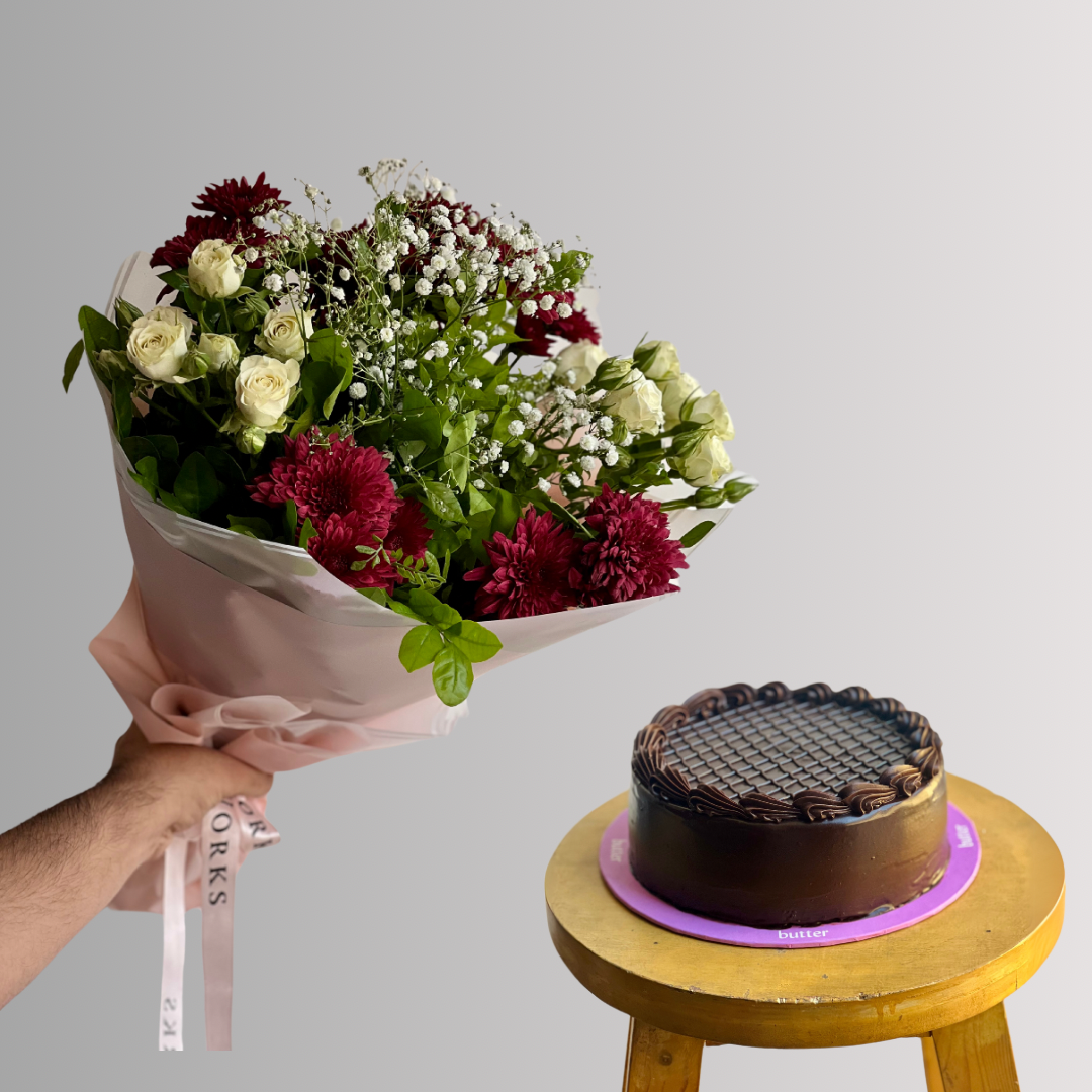 This beautiful bouquet is a stunning combination of purple chrysanthemums with spray roses, with a touch of baby's breath.