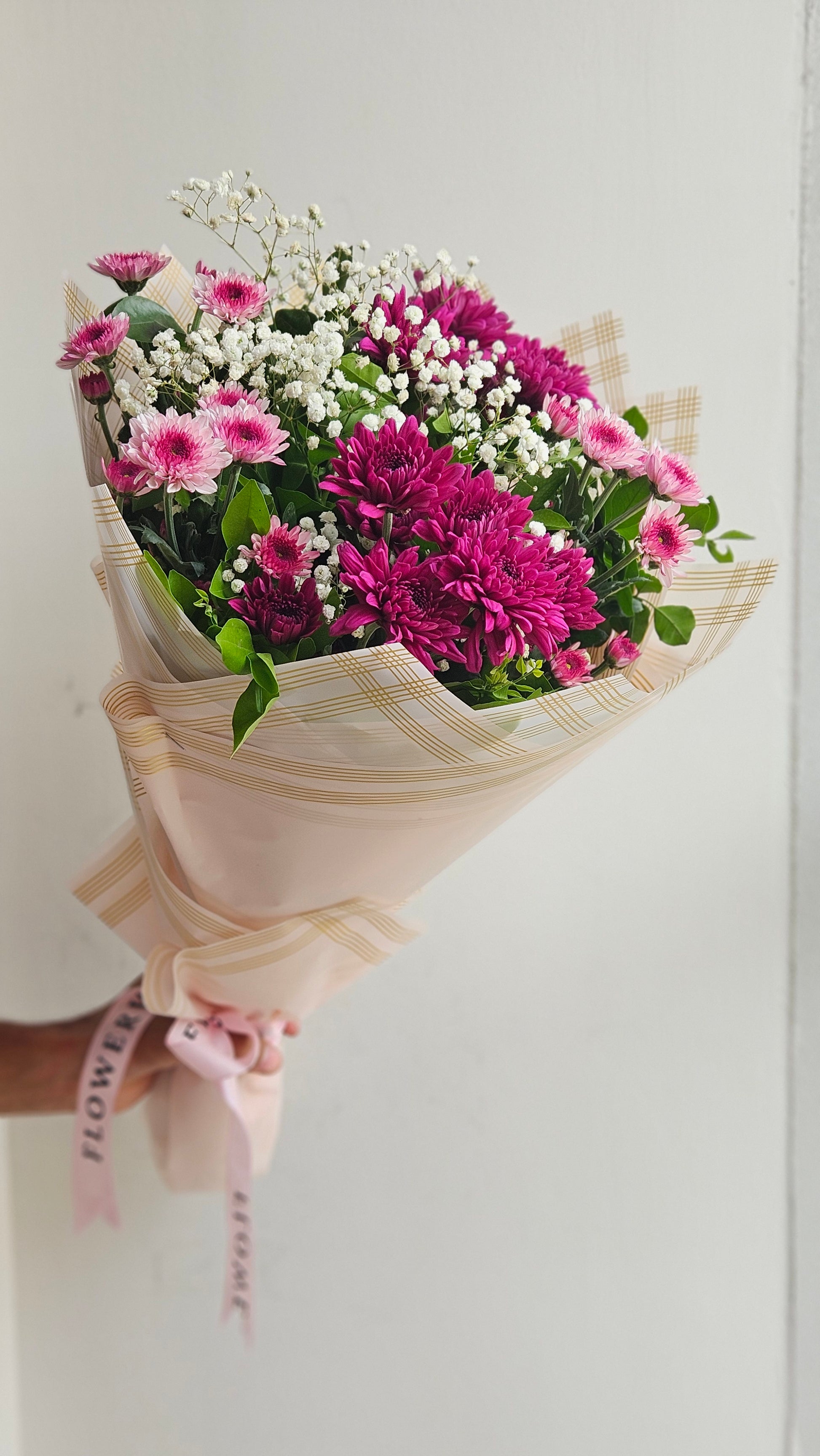 This beautiful bouquet is a stunning combination of purple and lilac chrysanthemums, with a touch of baby's breath.